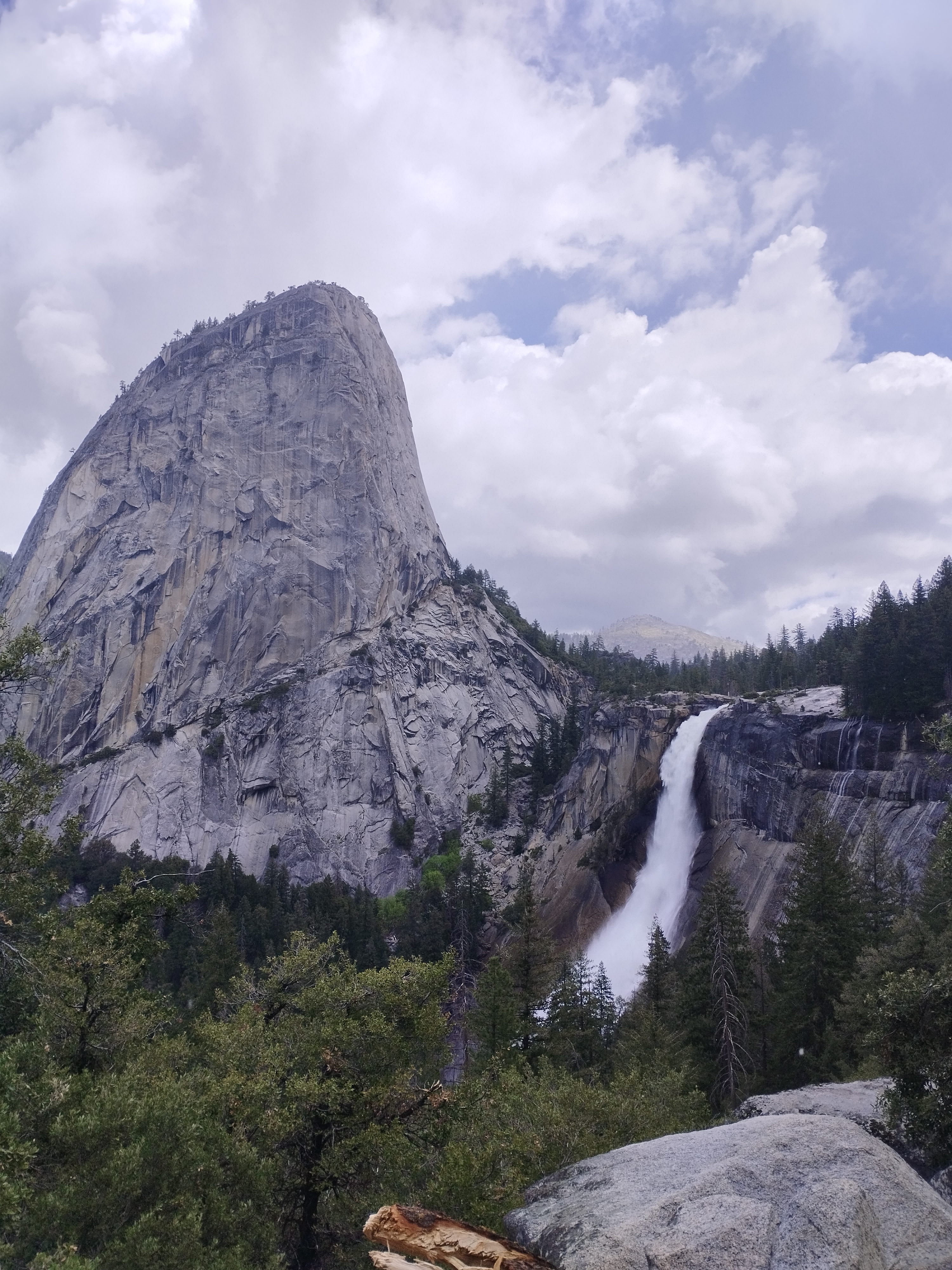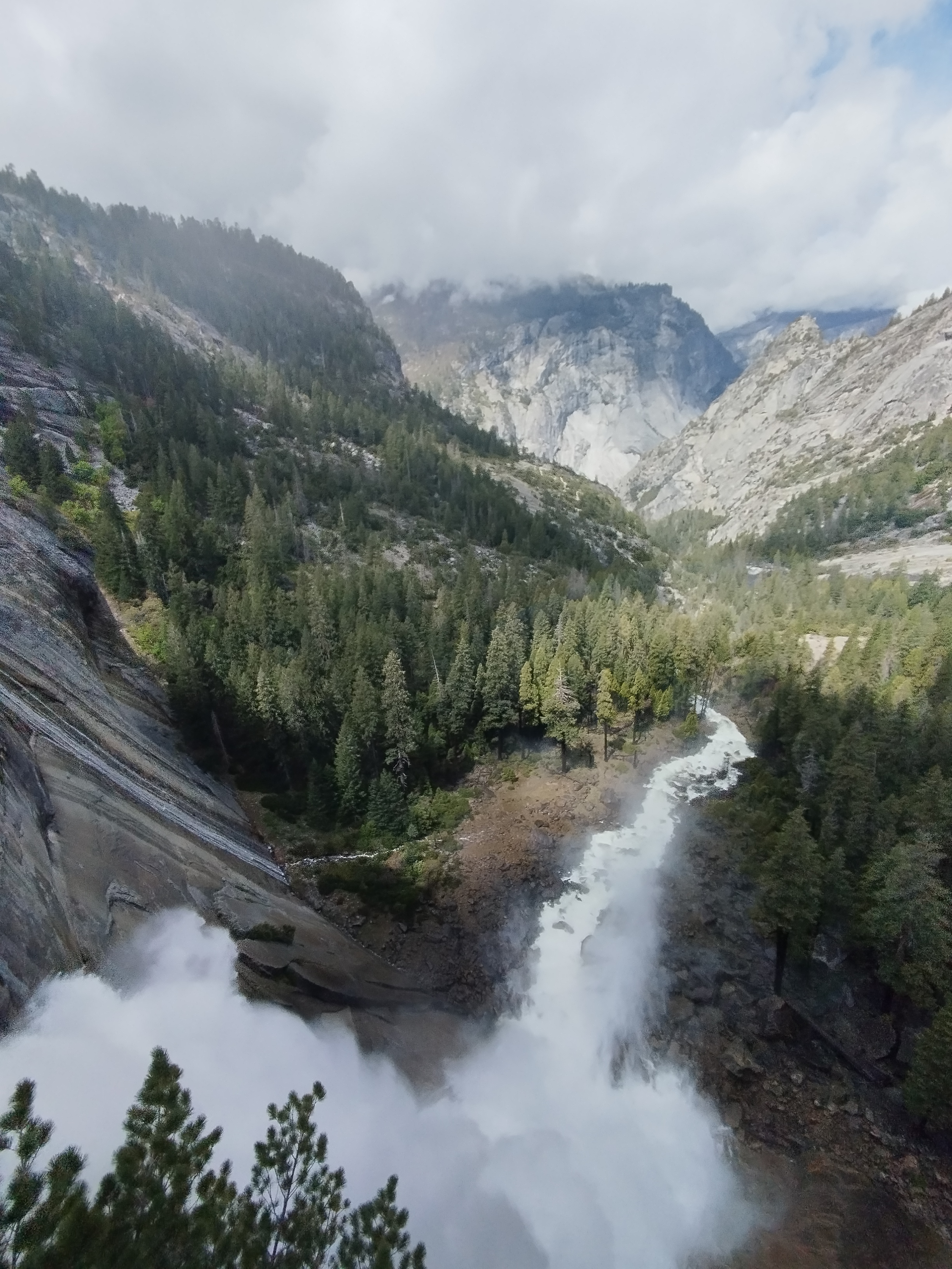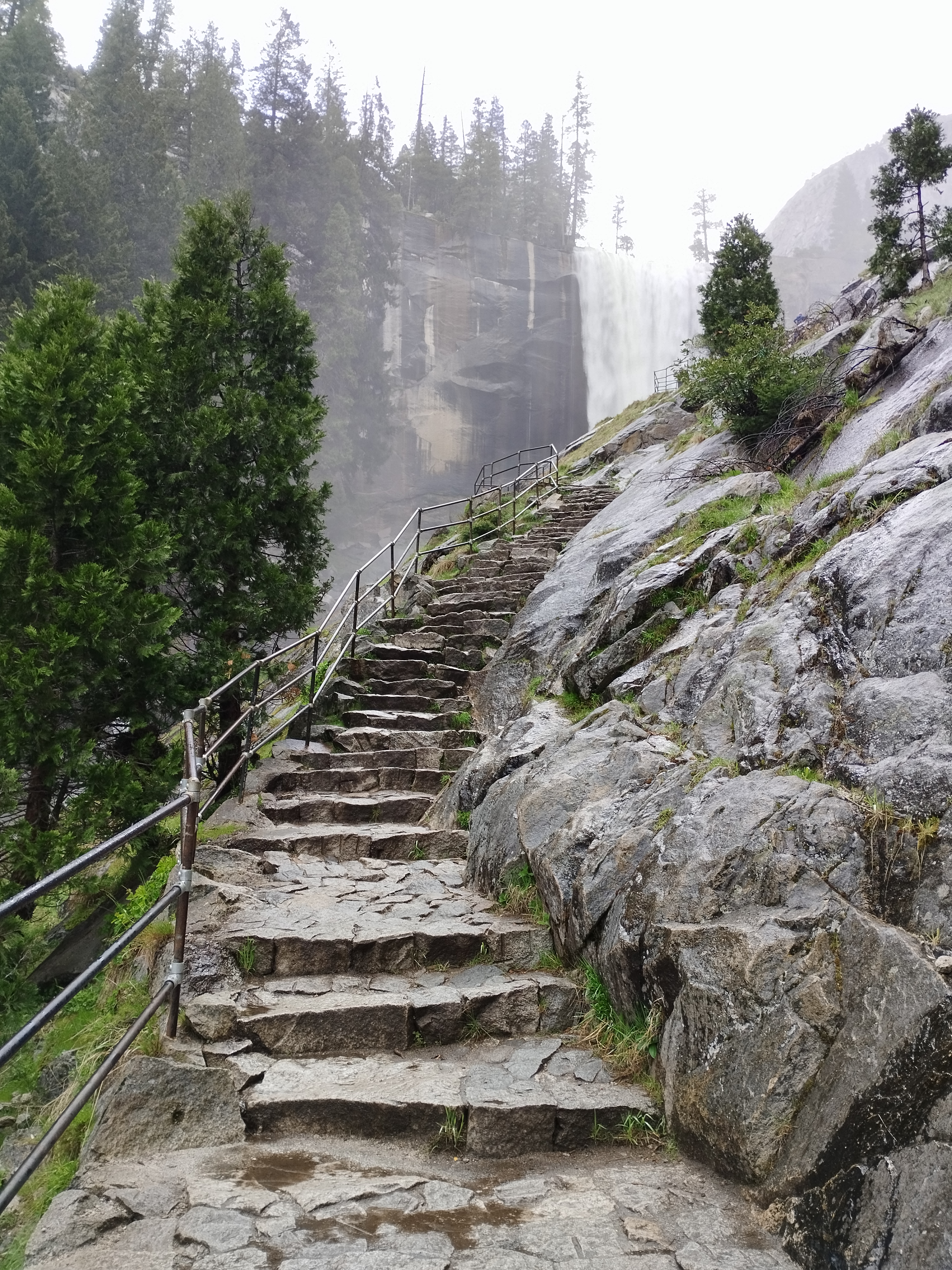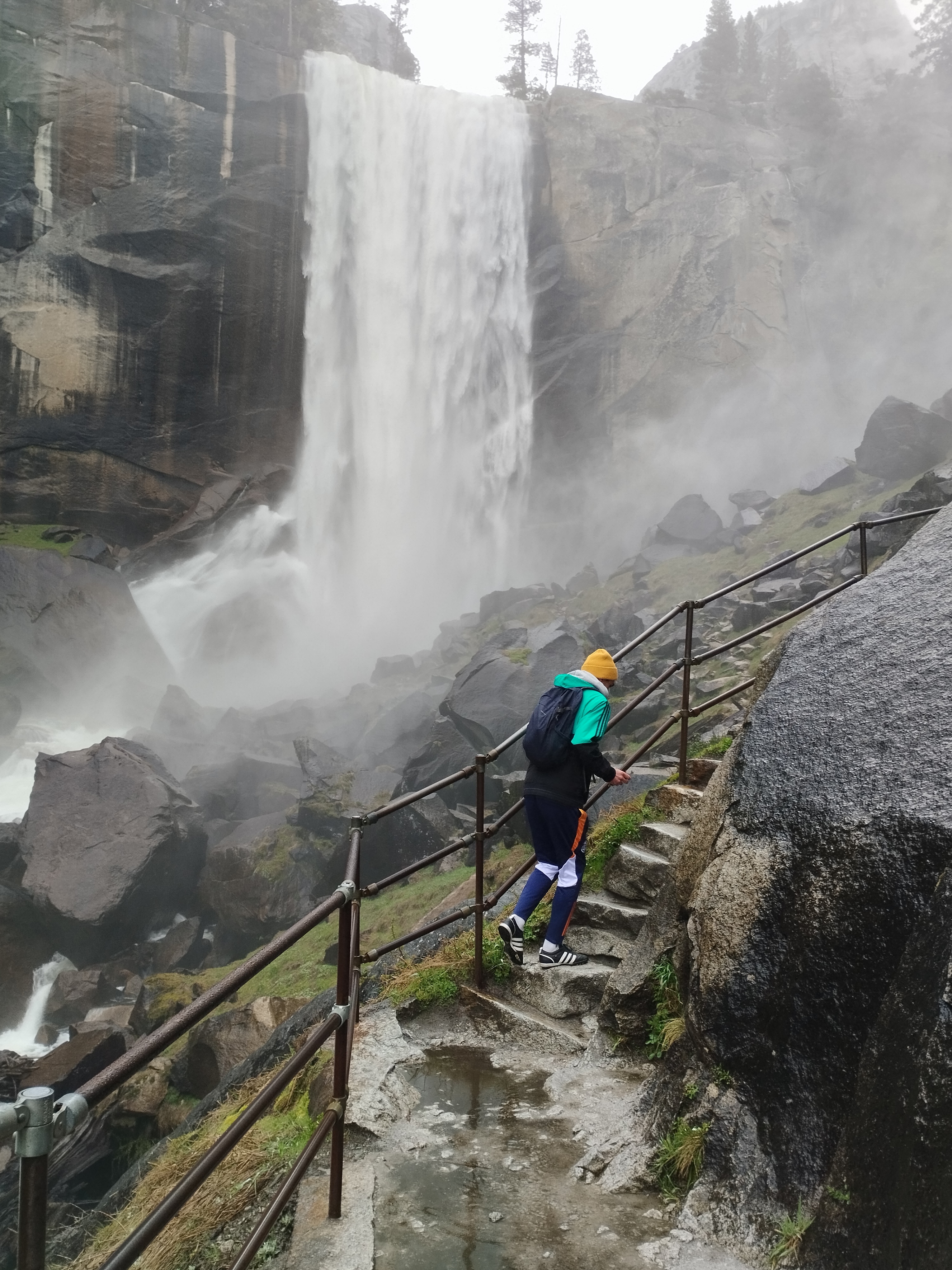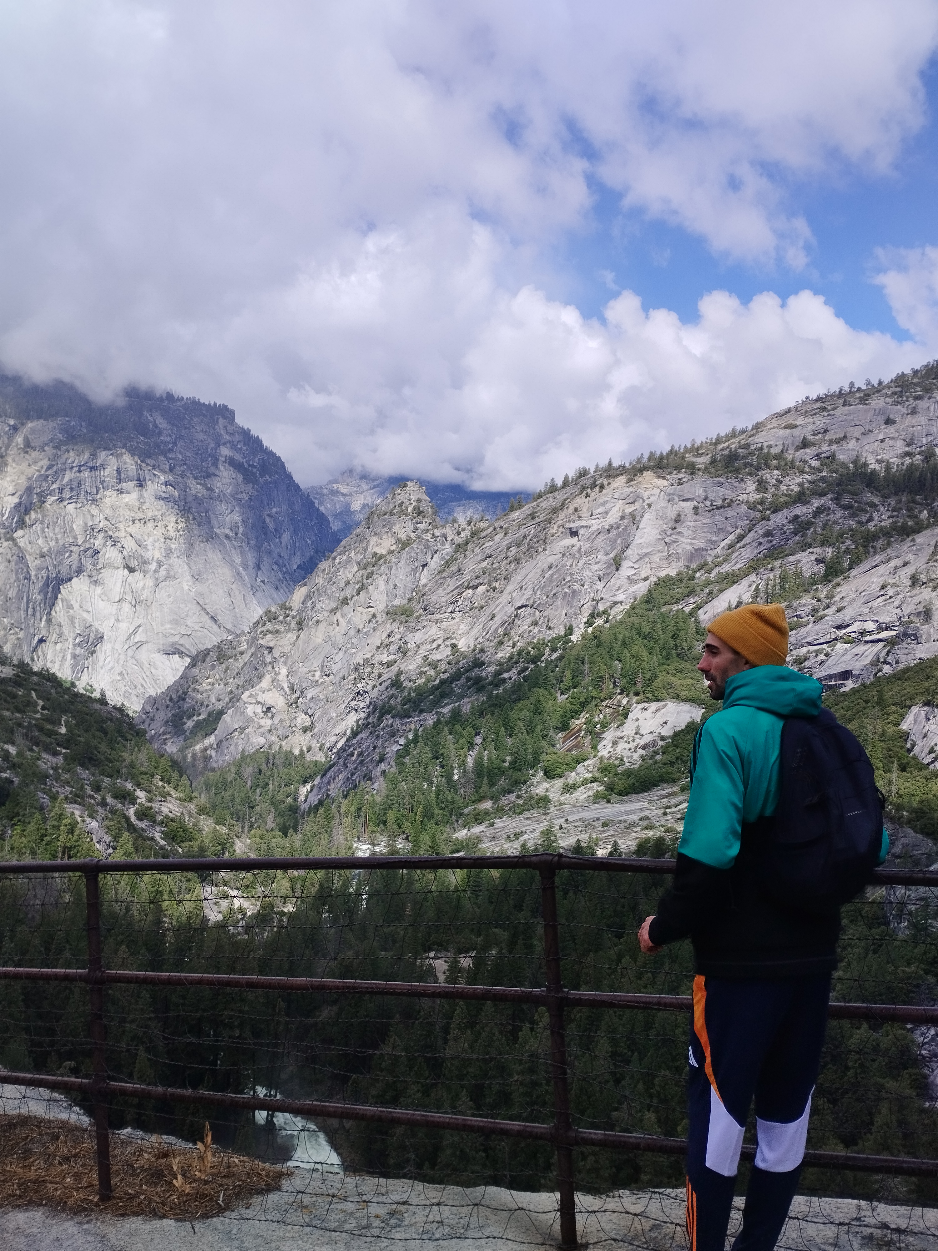 Nous avons choisi de faire la randonnée Mist trail jusqu’à Nevada falls, avec un retour par John Muir trail. Il me semble que nous avons mis environ 4h pour tout faire. Ca grimpe beaucoup mais c’est largement faisable. Il y a beaucoup d’escalier et Le débit d’eau était assez impressionnant. En arrivant au sommet, nous avons eu de la neige 🥶 Les cascades nous arrosent bien et, en plus de cela, il a plu 😆 Le soleil a également était présent. Enfait on a eu chaud et froid. Je ne sais pas comment on a fait pour ne pas tomber malade ^^ Moi j’avais un imperméable assez efficace, je n’étais donc pas mouillé sous mon manteau heureusement ! Mais on recommande cette randonnée. C’était très beau même avec un temps mitigé.