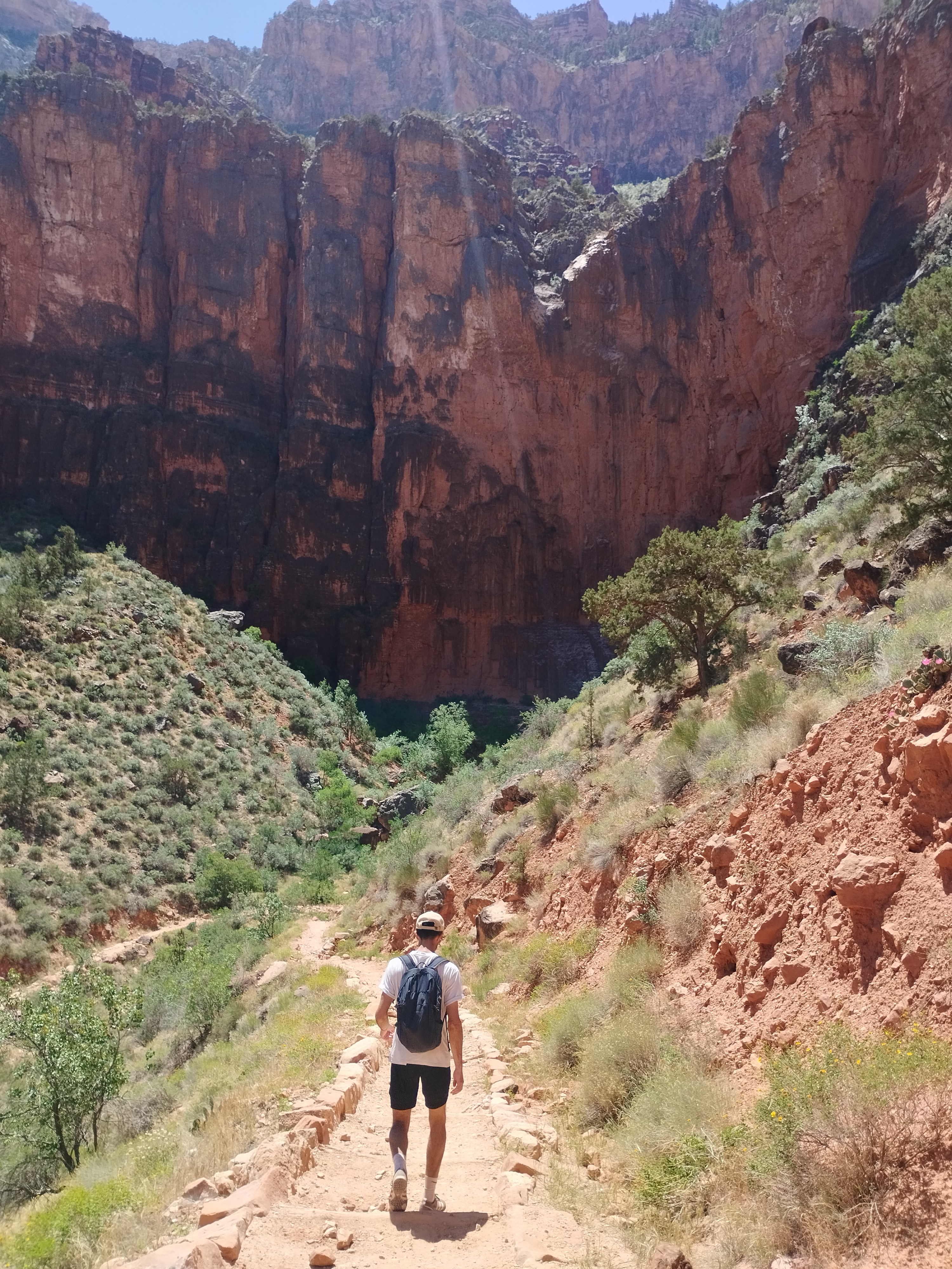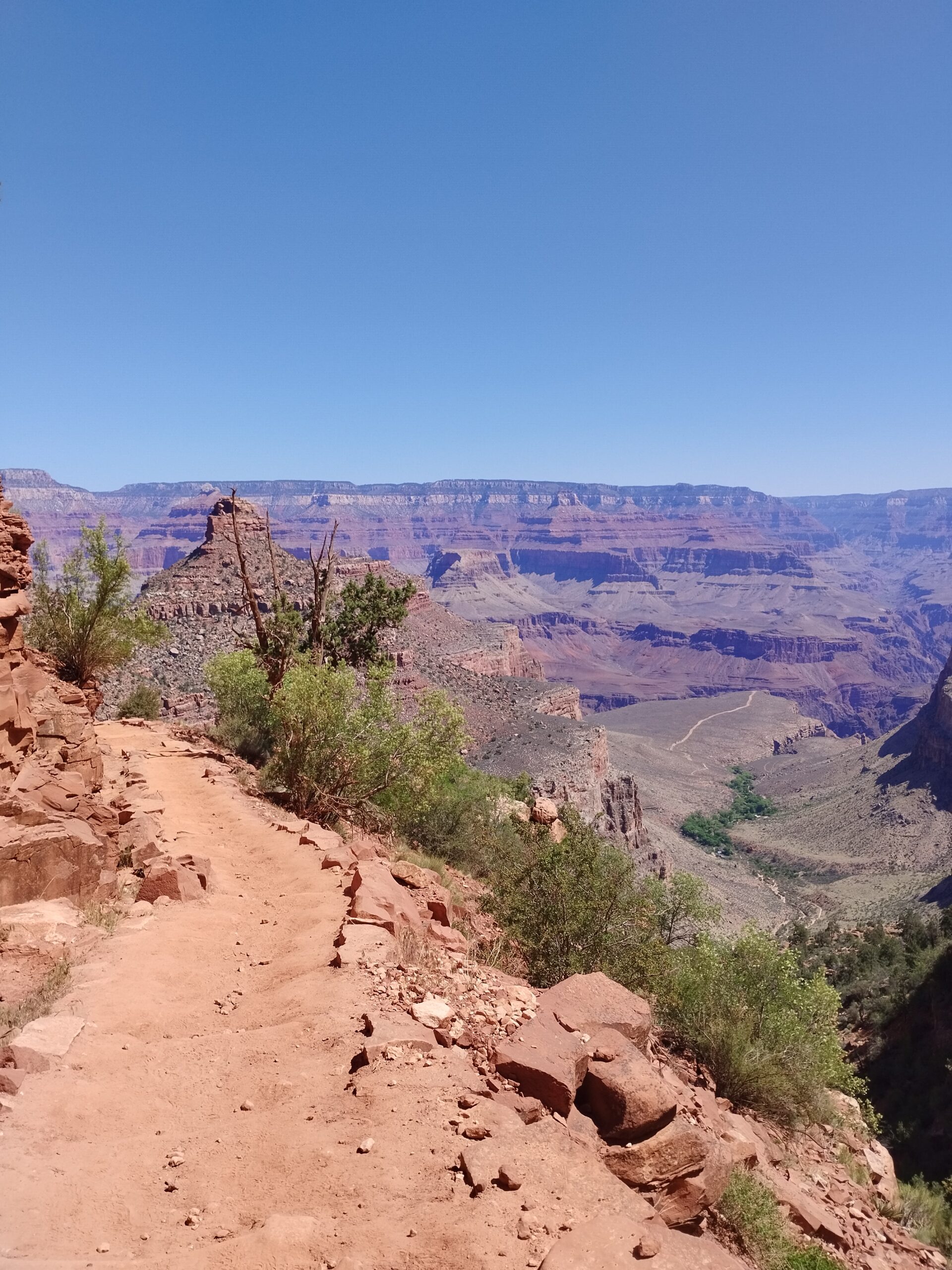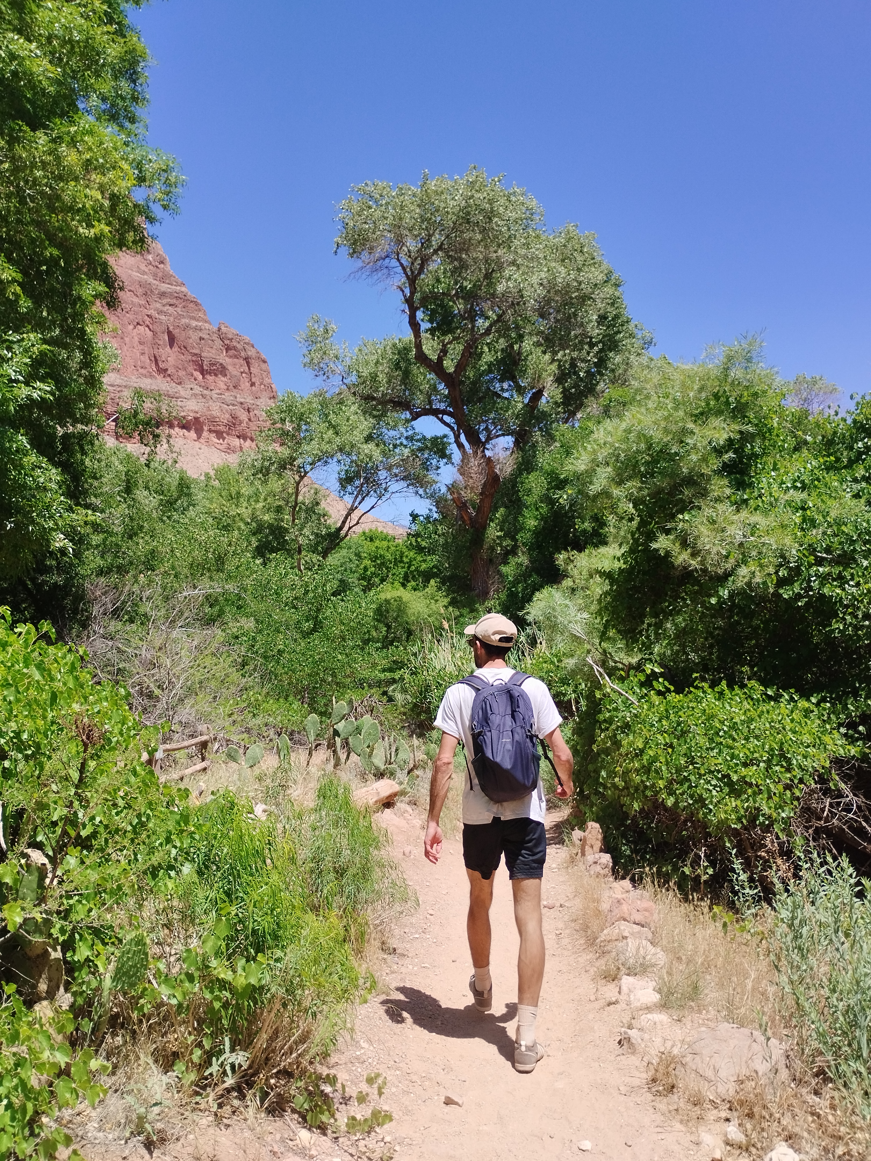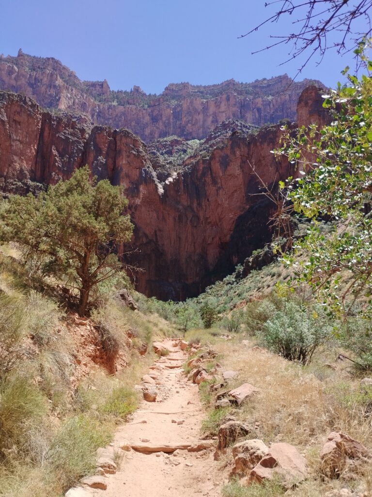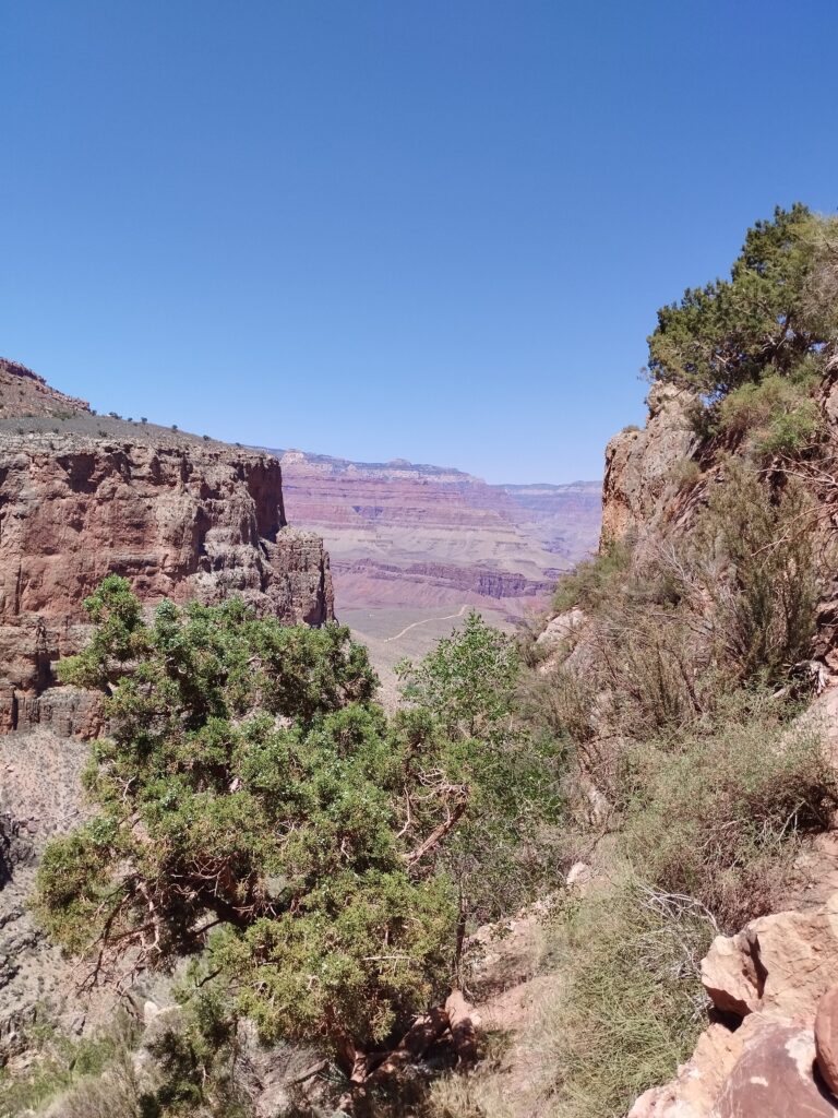 Le lendemain nous avons fait une partie de la randonnée Bright Angel Trail. Elle vous permet d’aller au fond du Grand Canyon. Nous sommes allés jusqu’à Havasupai Gardens. Le paysage est totalement différent d’en haut. Il y a beaucoup de végétation. Il y fait donc moins chaud. Le sentier de randonnée est très bien aménagé. Si vous prenez votre temps, c’est tout à fait faisable. Il y a deux points d’eau potable en chemin pour s’hydrater mais aussi se mouiller la tête. La plus grosse difficulté étant la chaleur…