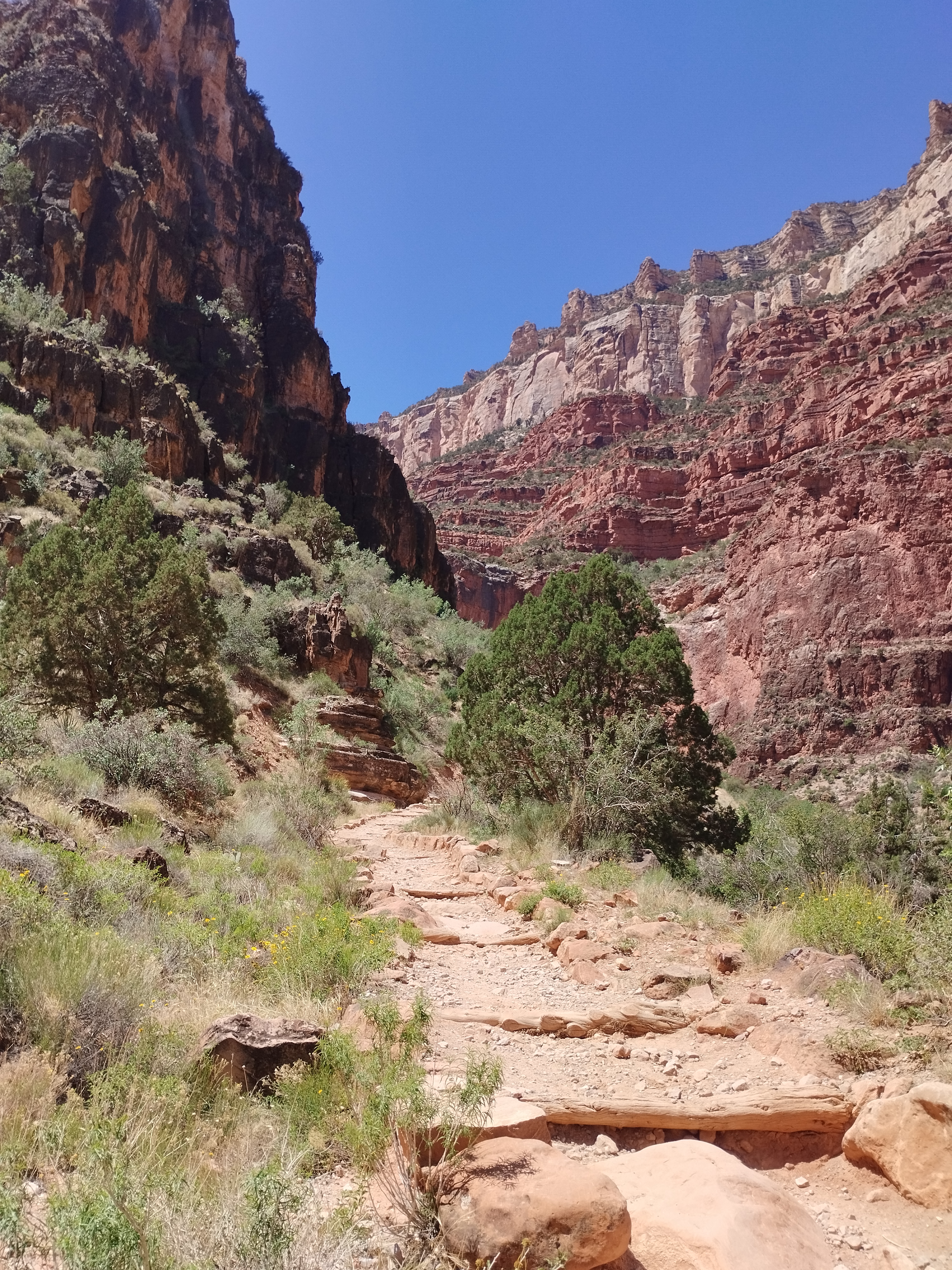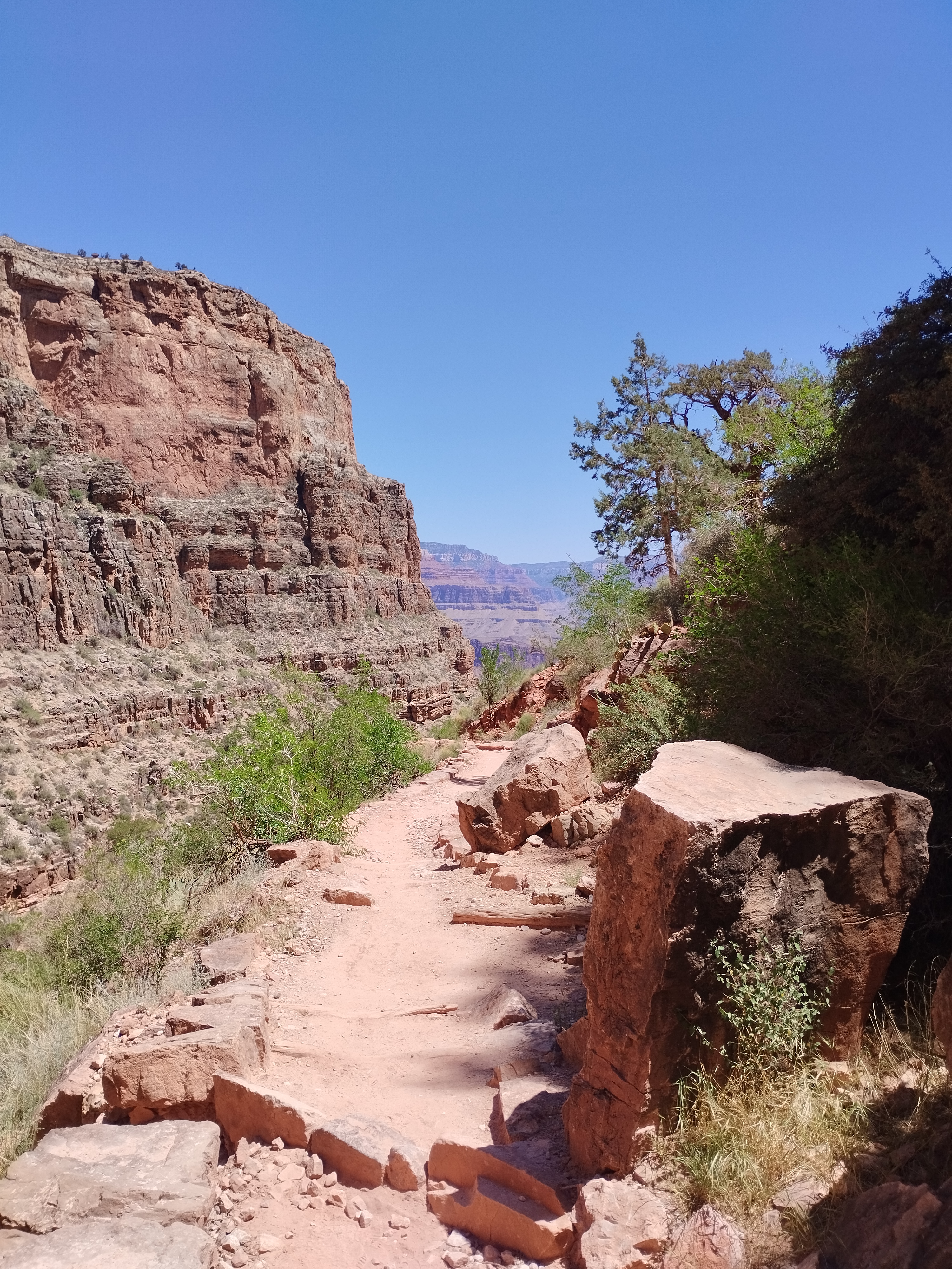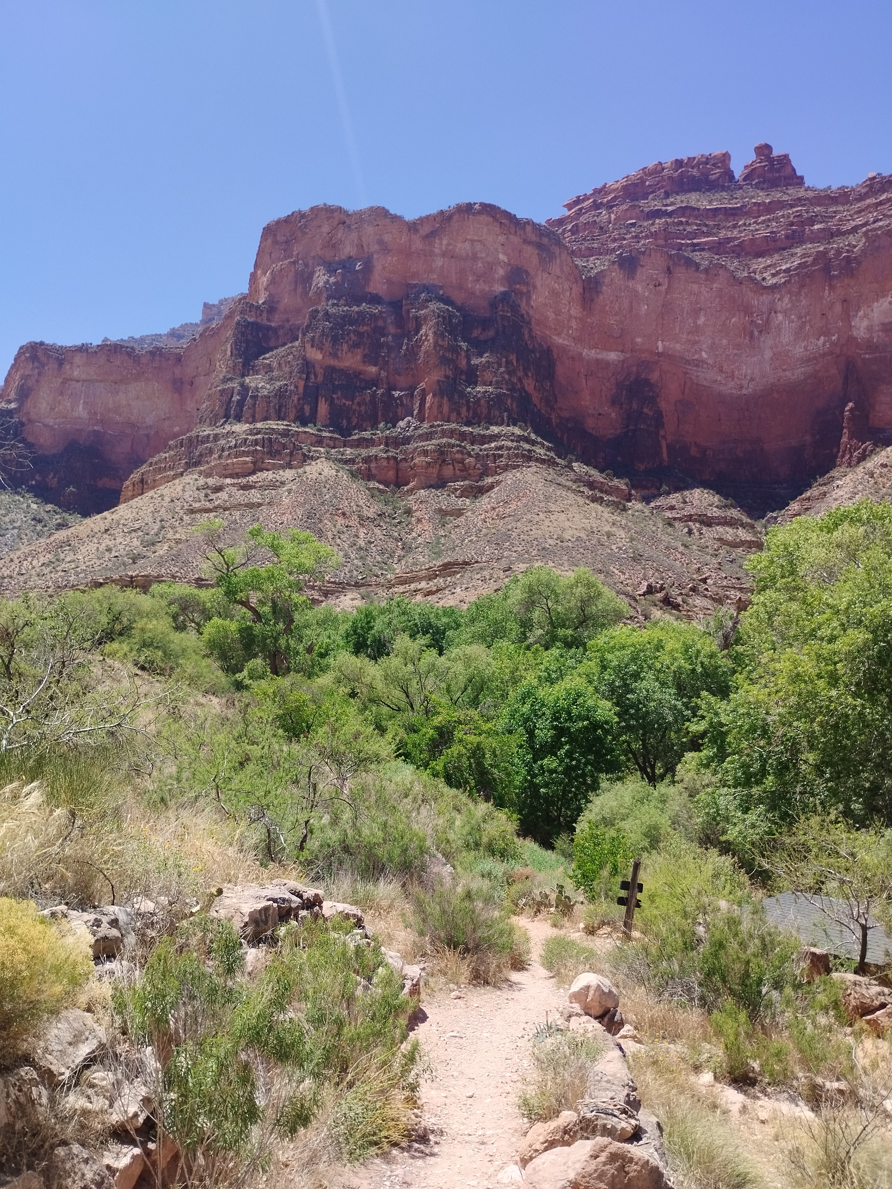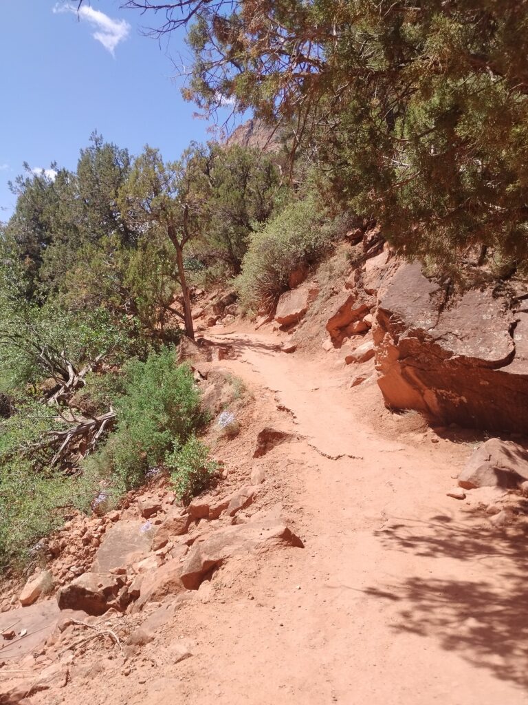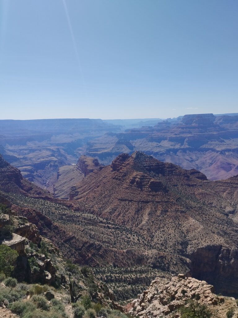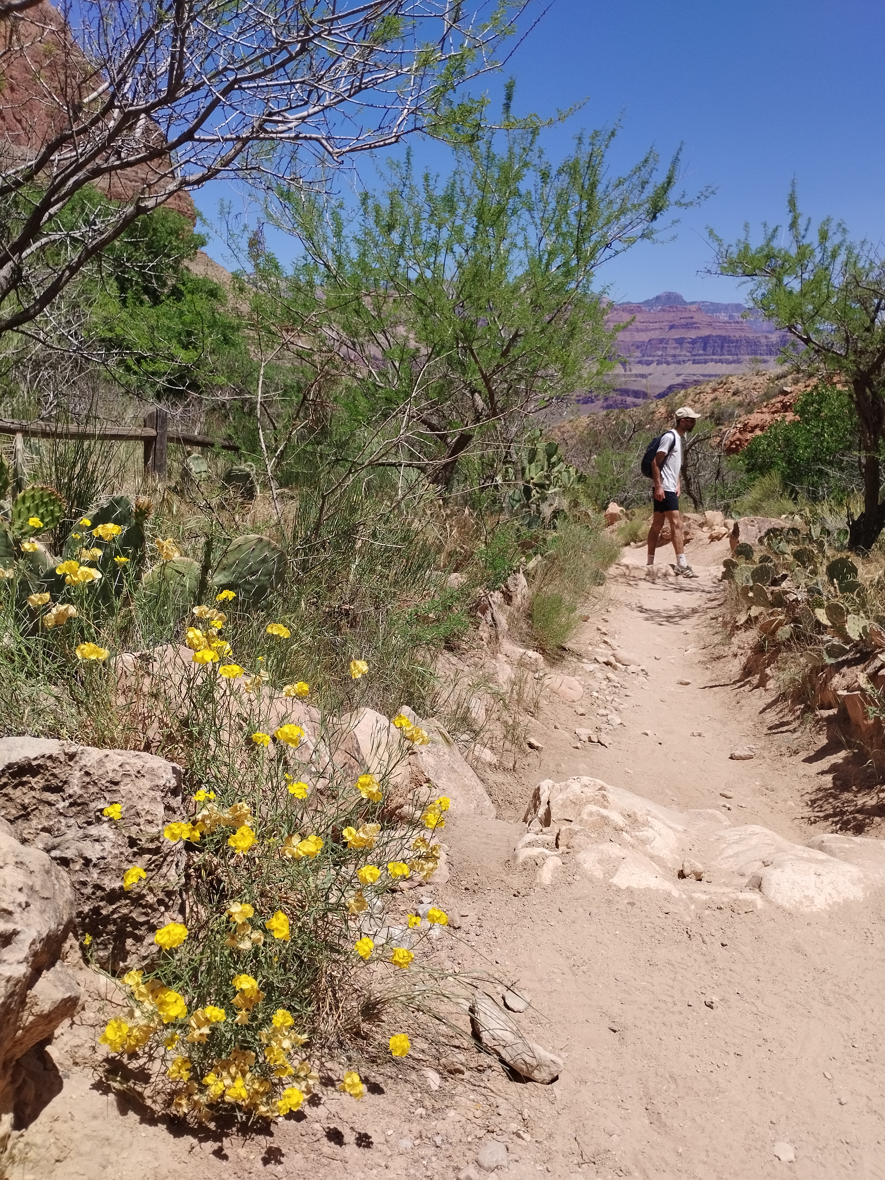Le lendemain nous avons fait une partie de la randonnée Bright Angel Trail. Elle vous permet d’aller au fond du Grand Canyon. Nous sommes allés jusqu’à Havasupai Gardens. Le paysage est totalement différent d’en haut. Il y a beaucoup de végétation. Il y fait donc moins chaud. Le sentier de randonnée est très bien aménagé. Si vous prenez votre temps, c’est tout à fait faisable. Il y a deux points d’eau potable en chemin pour s’hydrater mais aussi se mouiller la tête. La plus grosse difficulté étant la chaleur…