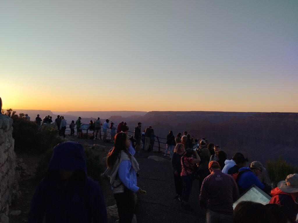 Le soir, nous sommes allés voir le coucher de soleil à Hopi Point. Il y avait beaucoup de monde mais il y a de la place pour tous. Par contre les gens passent par dessus les barrières pour s’assoir face au vide. Heureusement personne n’est tombé !
