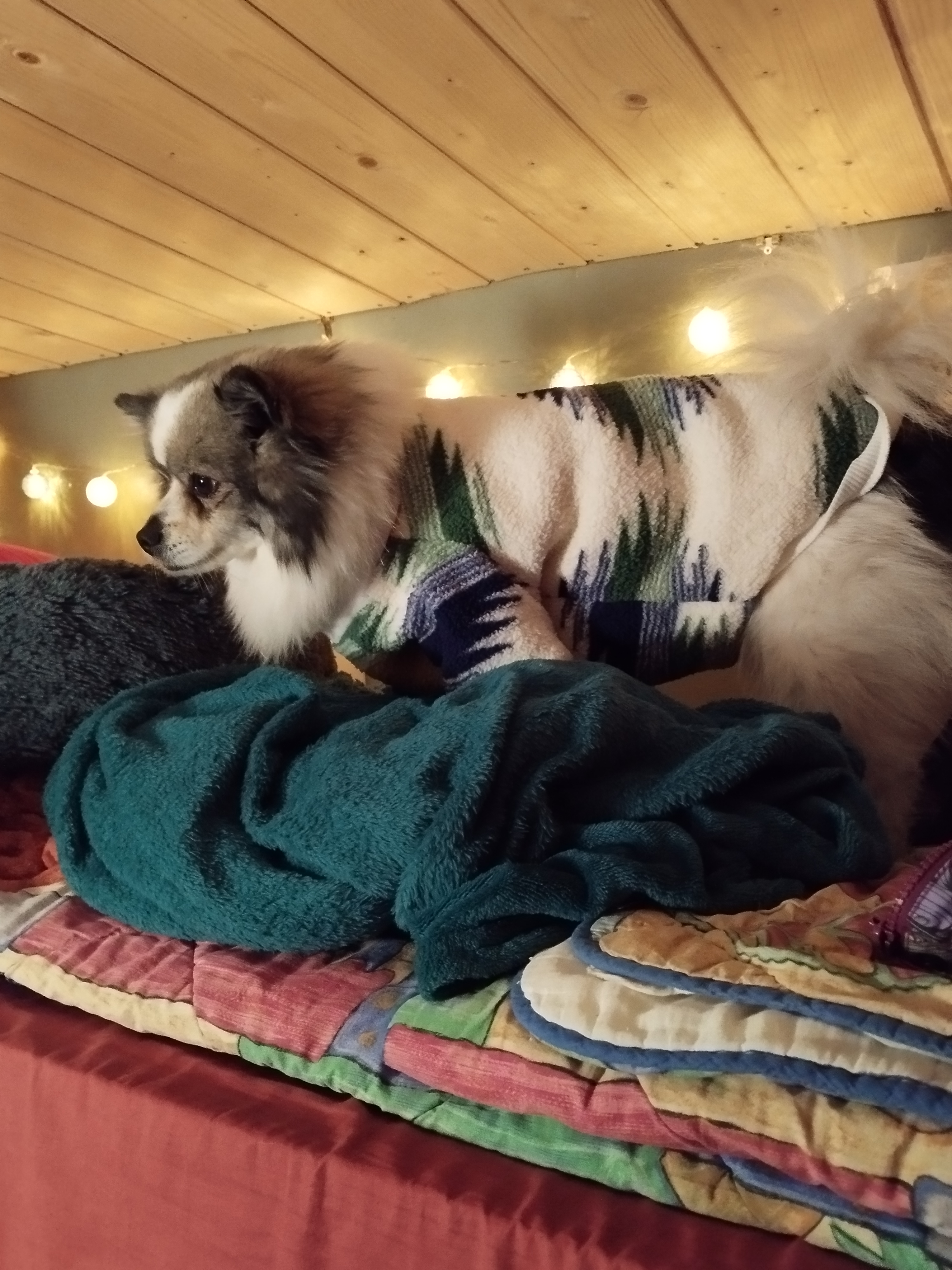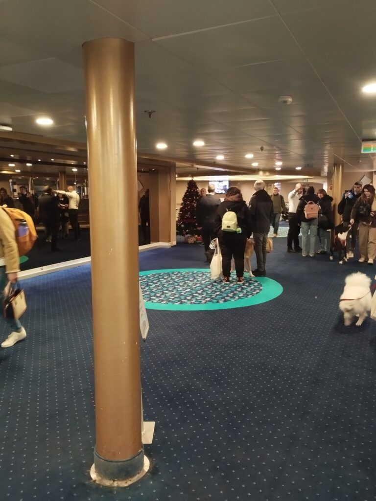 Concernant les chiens, ils sont vraiment bien acceptés. Il faut aller au dernier étage pour leur faire faire leurs besoins. Il y a un mini espace pour eux. J’avoue que j’ai trouvé ça un peu sale. Touity n’est pas allé là dedans. Il a fait pipi sur le pont et après on a rincé avec une bouteille d’eau ^^