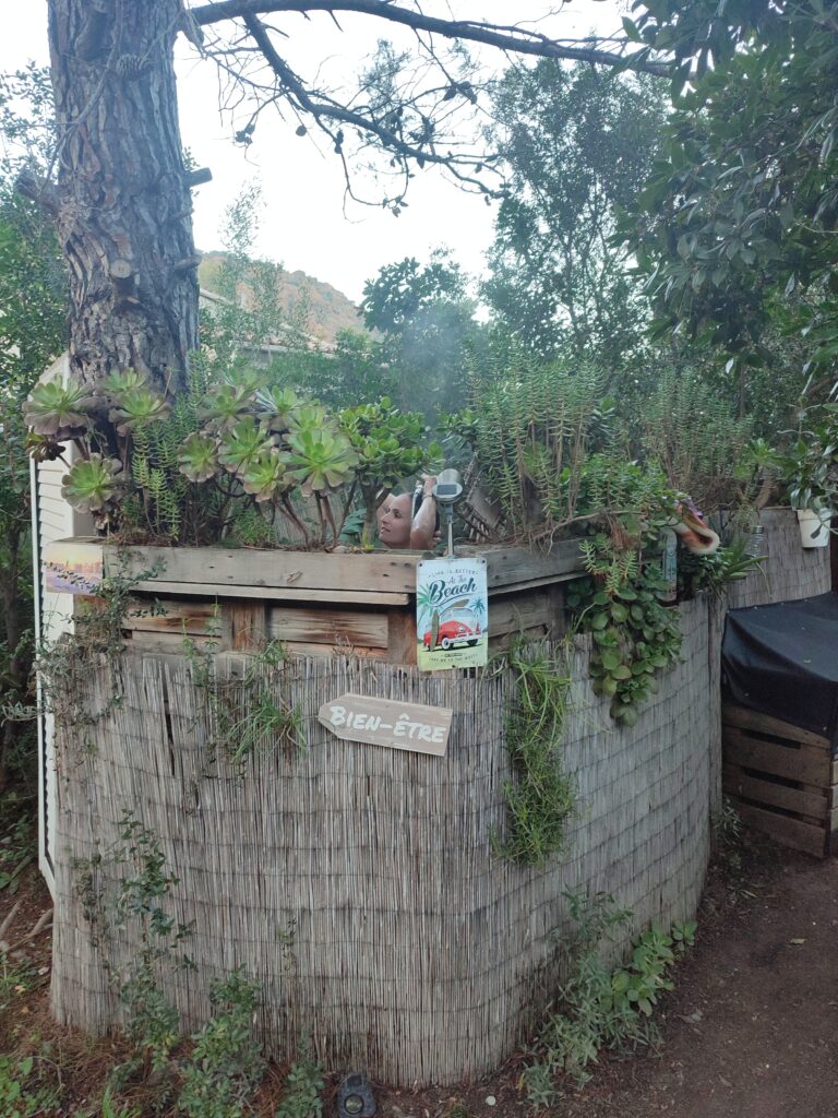 Plus tôt dans la journée on a voulu prendre une douche à Macinaggio car il y en a en intérieur à disposition qui coûte 2€. Il faisait hyper chaud à l’intérieur, c’était trop agréable car il ne faisait pas très beau ce jour-là. Je mets la pièce de 2€, l’eau commence à couler et en fait c’était froid… 🥶 J’étais dégoutée !