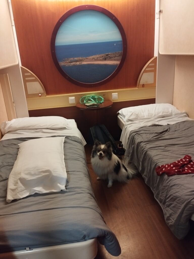 A l’aller le bateau était complet avec énormément de chiens à bord. Par contre le retour était plus tranquille. D’ailleurs notre cabine pour le retour était beaucoup plus sympa que celle de l’aller.