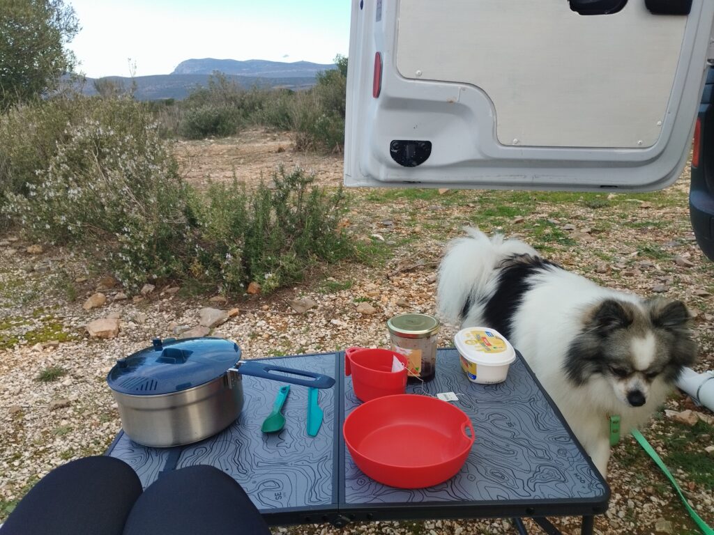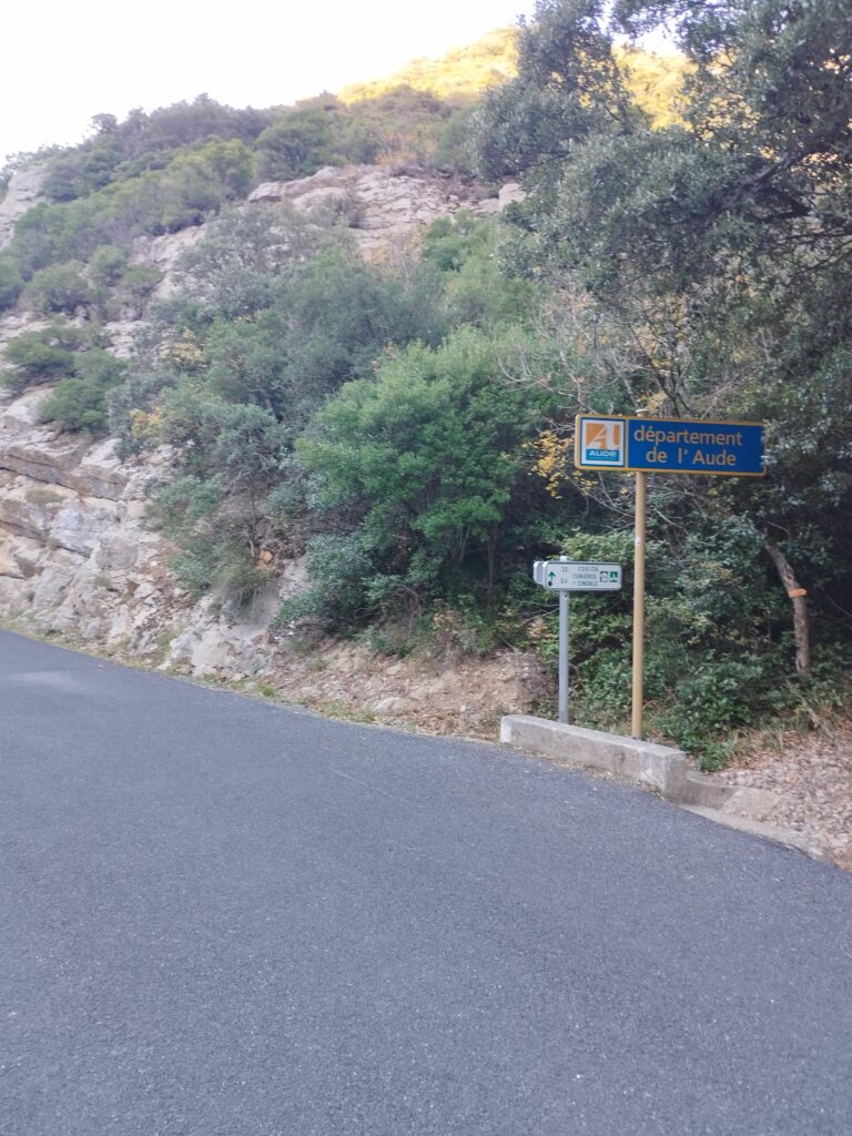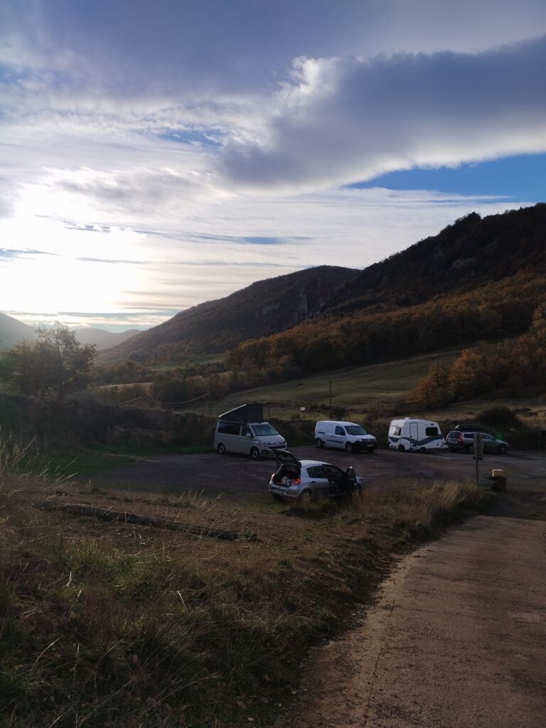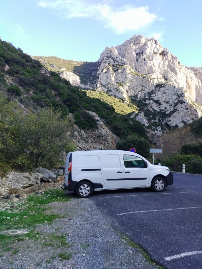 Nous sommes arrivés en début de soirée le vendredi et avons trouvé ce petit parking proche des Gorges de Galamus pour notre randonnée du lendemain. Comme je suis toute seule avec Touity, ça me rassurait qu’il y ait d’autres voyageurs atour. J’ai parlé avec un lituanien qui voyageait avec sa copine et sa fille. Ils font le tour de l’Europe avec leur petite caravane.