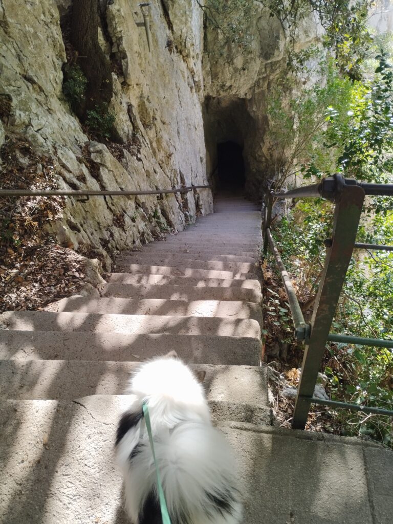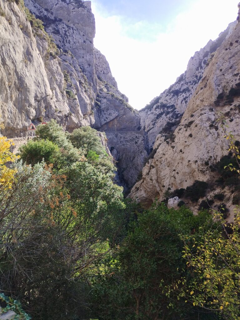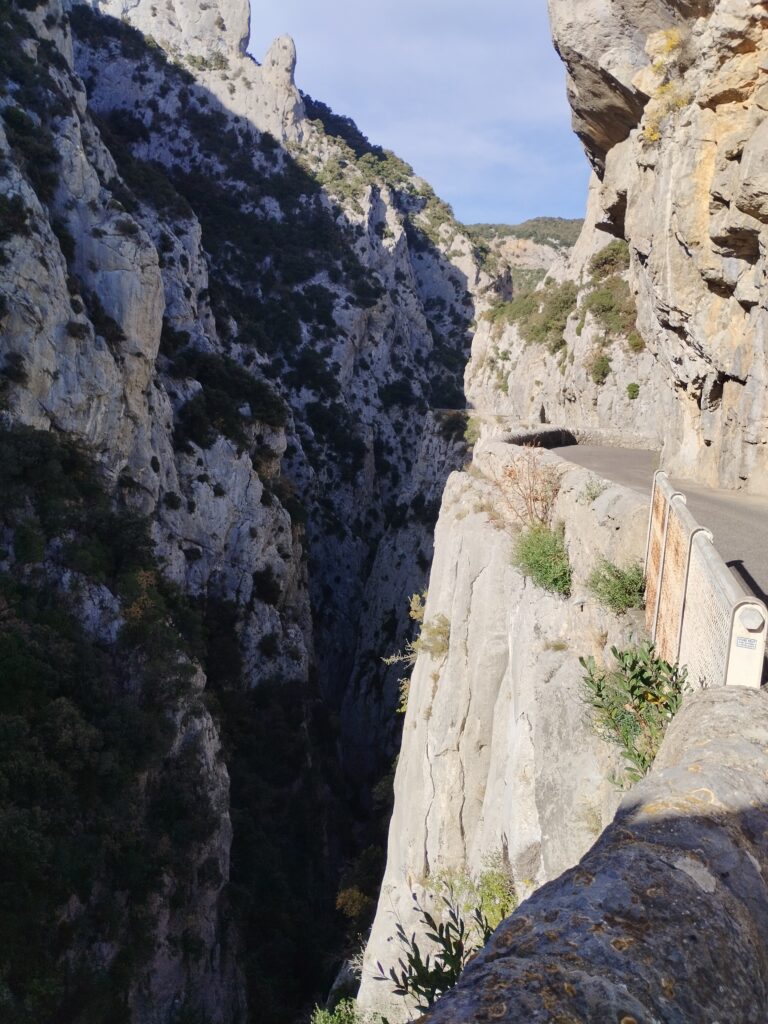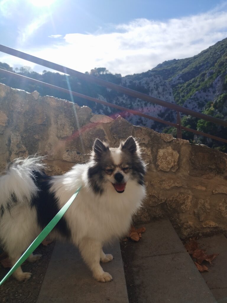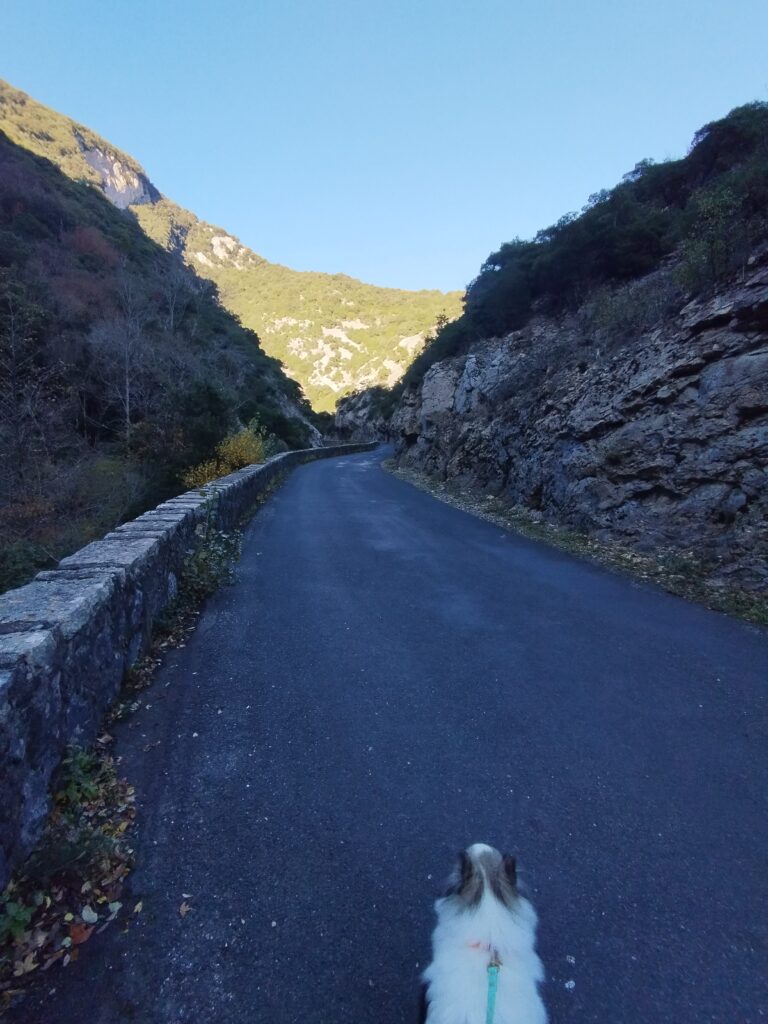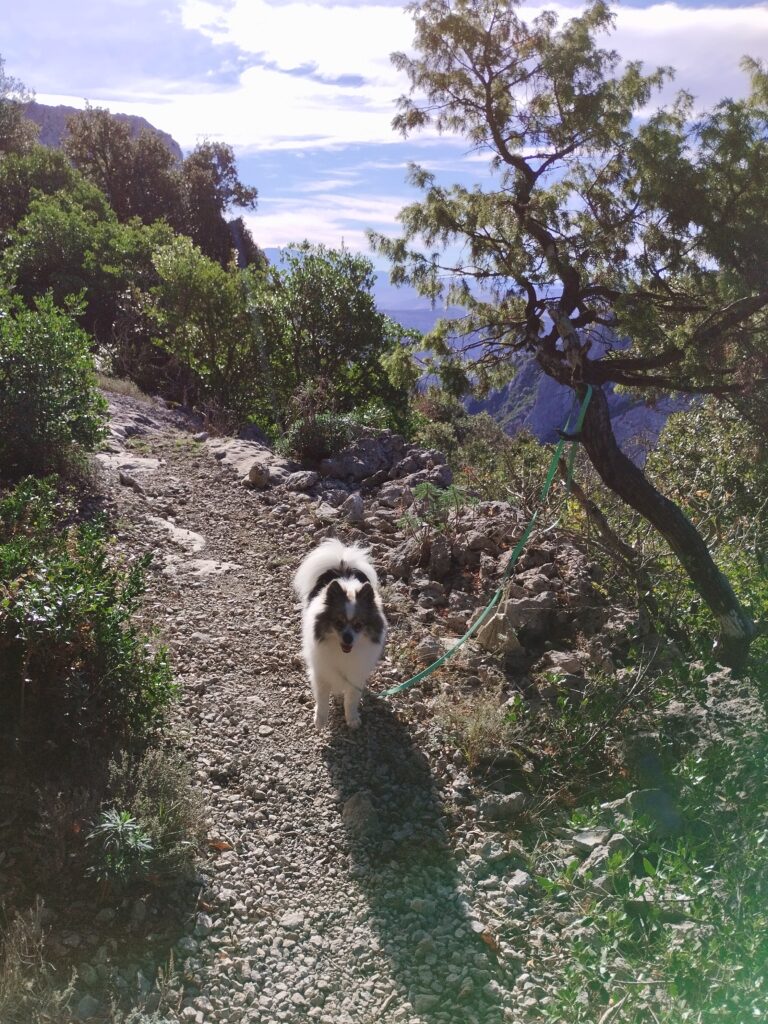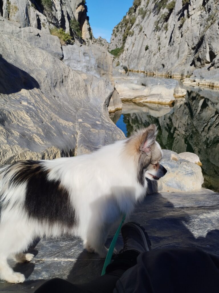 J’ai choisi de faire une randonnée qui fait une boucle autour des gorges. On prend de la hauteur pour admirer la vue, puis on revient par la route à flanc de falaise. Cette marche passe par l’Ermitage de Saint Antoine. Quand j’y étais, les chiens avaient le droit de traverser l’Ermitage sans problème !
